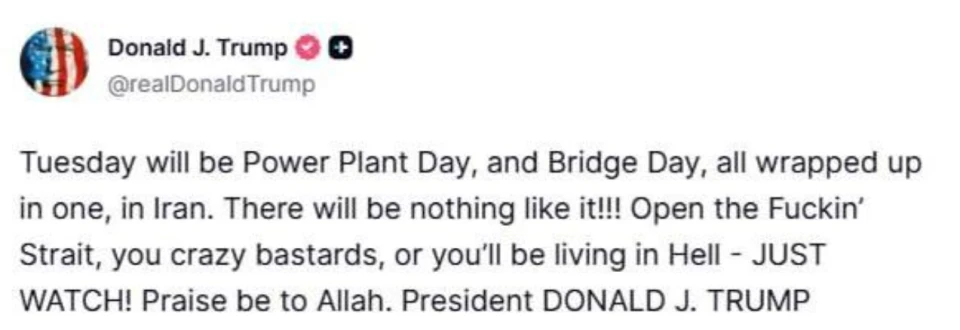 In a post on the social media platform Truth Social, the American leader warned of large-scale strikes on critical infrastructure, calling April 7 both “Power Plant Day” and “Bridge Day.” Trump emphasized that if the demands are ignored, the country faces unprecedented destruction, which he compared to “living in hell.”