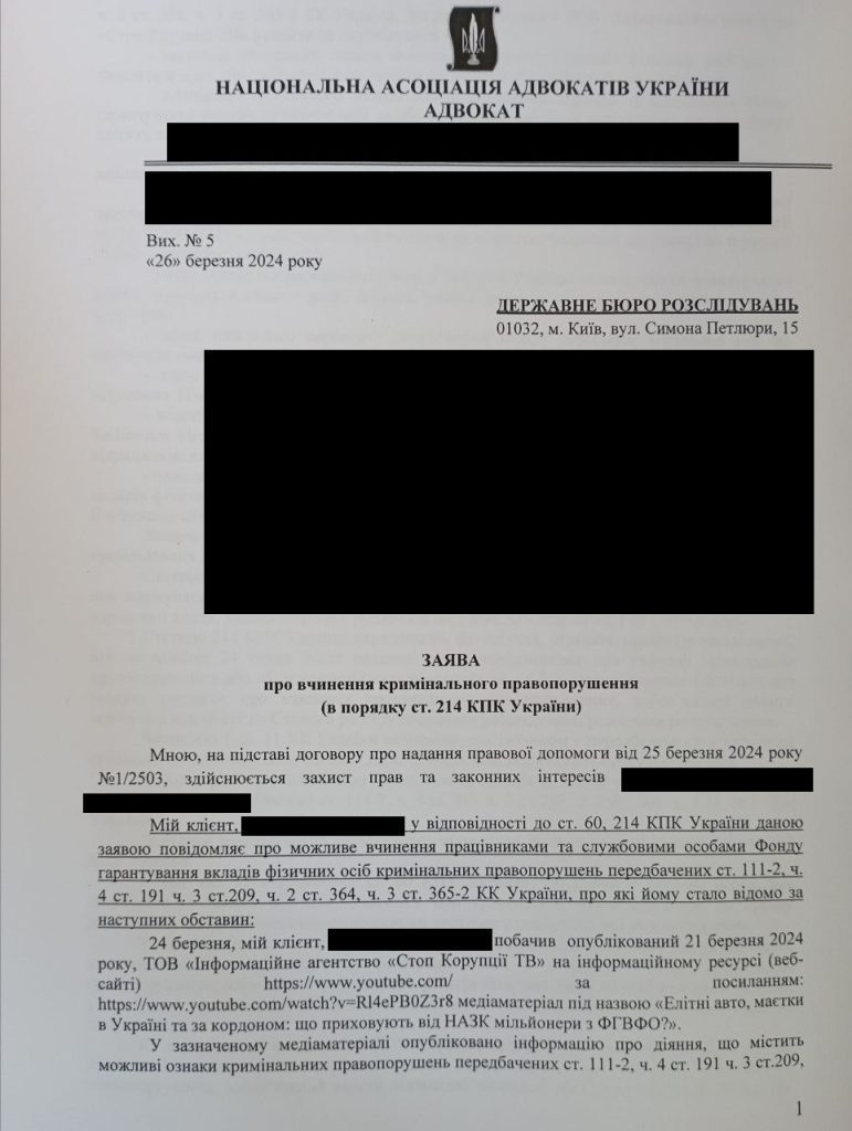 Ponadto, w oparciu o niedawne dochodzenie przeprowadzone przez zespół Antykor w sprawie statusu majątkowego urzędników Funduszu, media UA.NEWS złożyły zarzuty popełnienia przestępstw w Funduszu Gwarancji Depozytów do Służby Bezpieczeństwa Ukrainy, Państwowego Biura Śledczego, Policji Narodowej i Narodowej Agencji Zapobiegania Korupcji.