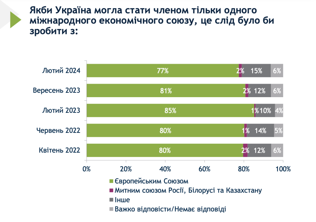 Jednak liczba respondentów, którzy uważają, że Ukraina powinna stać się członkiem UE, maleje. W szczególności w lutym 2024 r. 77% Ukraińców uważa, że nasz kraj powinien być członkiem Unii Europejskiej. To o 8% mniej niż w lutym 2023 roku.