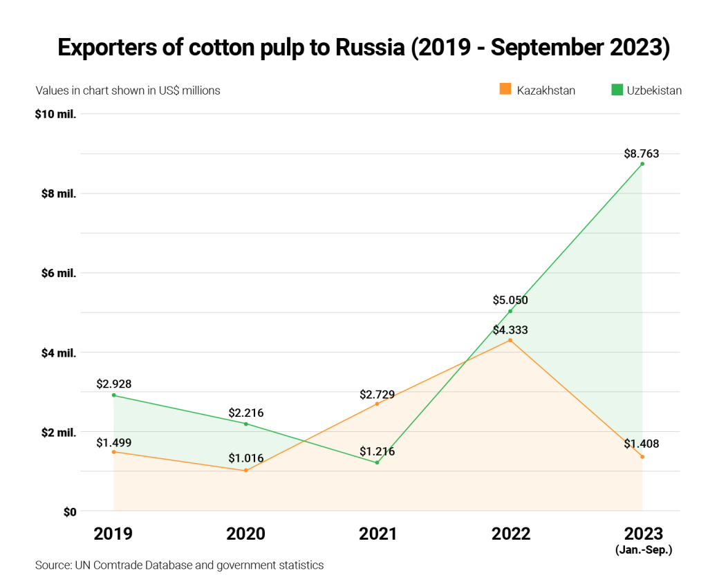 Kazachstan i Uzbekistan, według badania, zwiększyły eksport do rosji surowców wykorzystywanych do produkcji prochu strzelniczego. W szczególności, w dniu 21 grudnia rosyjska opozycyjna publikacja «Ważnyje Istorii», kazachska opozycyjna publikacja «Wlast» oraz projekt «Demaskowanie przestępczości zorganizowanej i korupcji» opublikowały wspólne dochodzenie, które wykazało, że w 2021 r. Kazachstan i Uzbekistan łącznie dostarczyły do rosji pulpę bawełnianą o wartości prawie 4 mln USD, a w 2002 r. - prawie 10 mln USD.