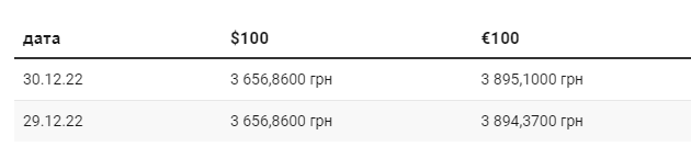 27 декабря 2022 года в обменных пунктах Украины курс доллара в продаже вырос на 10 копеек до 40,60 гривен за доллар. Курс евро вырос на 10 копеек до 42,60 гривен за евро.