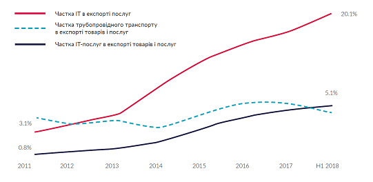 Так, в этом году IT-индустрии удалось обогнать трубопроводный транспорт в структуре украинского экспорта и подняться на 2 место в этой категории. Сейчас IT составляет более 20% экспортируемых услуг, передает ЭП.