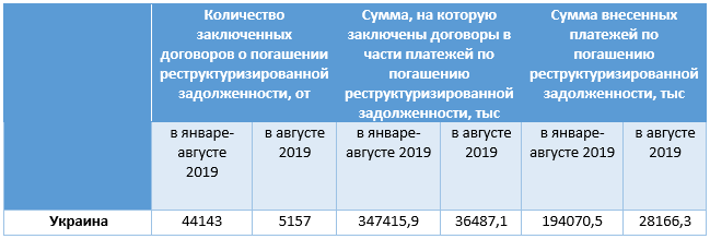 Согласно постановлению Кабинета Министров Украины от 21.10.1995 № 848 и от 27.06.2003 № 976 в январе-августе 2019 года с населением было заключено 44,1 тыс. договоров по погашению реструктуризированной задолженности (таблица 1).