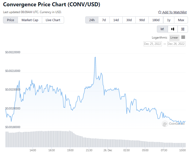Котировки CONV зафиксировались на отметке $0.0018, а рыночная капитализация токена поднялась до $2.30 миллионов. Этот показатель вырос почти вчетверо за последнюю неделю. Впрочем, за последние сутки курс цифрового актива упал на 2% в сутки. Интересно, что несмотря на то, что Convergencе даже не входит в топ-100 криптовалют, только за прошедшие 24 часа трейдеры обеспечили объемы торгов в размере $7.82 миллионов.