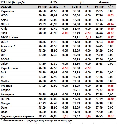 По данным мониторинга «Консалтинговой группы А-95», средние розничные цены на бензин А-95 составляют 48,73 гривен за литр (-0,13 гривен), на дизельное топливо - 52,67 гривен за литр (-0,05 гривен), на автогаз - 26, 85 гривен за литр (-0,07 гривны).