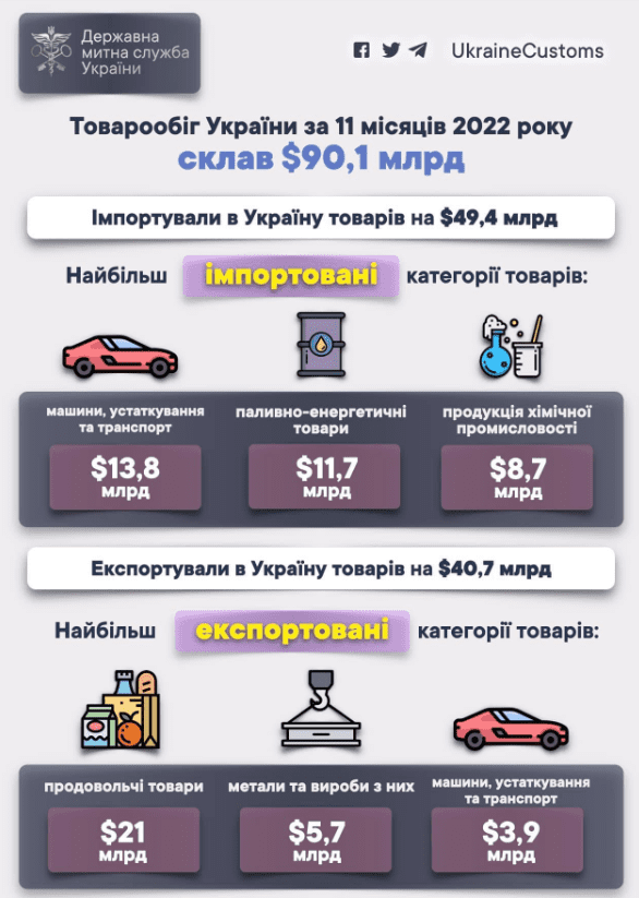 Товарооборот Украины составил $90,1 млрд за 11 месяцев 2022 года. В январе-ноябре в Украину импортировали товаров на $49,4 млрд, экспортировали из Украины продукции на $40,7 млрд, сообщает пресс-служба Гостаможни.