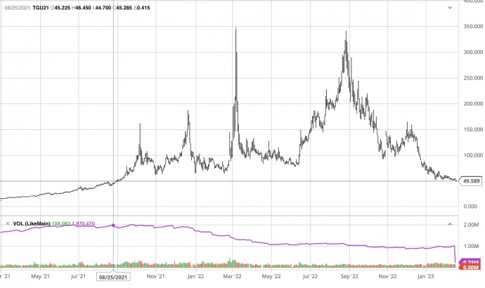 Базовые фьючерсы на март упали в цене на 4,8% до 49,5 евро за МВт-ч, или 555,73 доллара за тысячу кубометров. Это - самый низкий уровень закрытия с конца августа 2021 года. В этом году цена газа в Европе упала на около 35%.