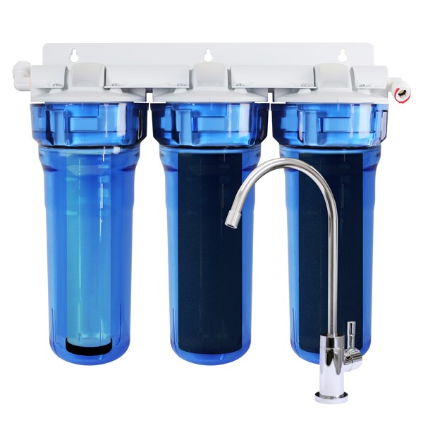Основа любой системы подобного типа — три колбы с картриджами внутри. Сначала вода собирается в специальном баке, а из него поступает в колбы, одну за другой. В каждой из них — один картридж из древесного угля или полипропилена. Он помогает очистить жидкость от вредной органики, хлора и механических загрязнений. После этого вода подается на очистительную мембрану, в которой и начинает работать принцип обратного осмоса. В некоторых моделях последний этап подготовки питьевой воды — наполнение ее минералами.