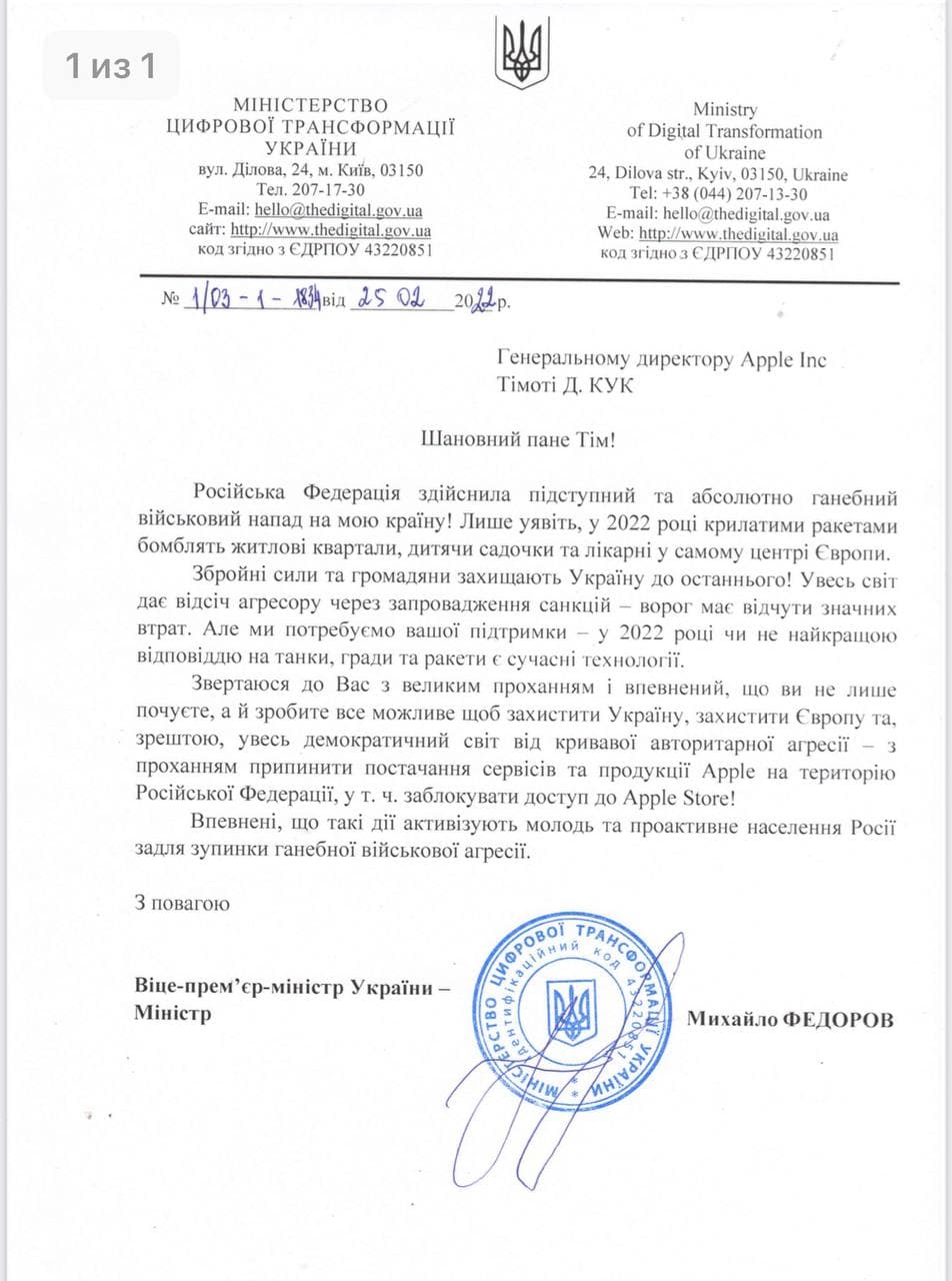 Министр цифровой трансформации Украины Михаил Федоров обратился с официальным письмом к главе корпорации Apple Тиму Куку с просьбой заблокировать для россиян магазин приложений Apple Store.