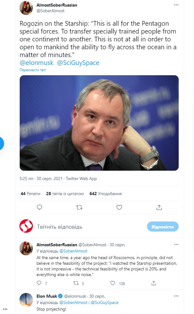 Рогозин же заявил российскому пропагандистскому изданию Газета, что SpaceX разрабатывает космический корабль-ракету Starship «для спецназа, чтобы перебросить с одного континента на другой», а «вовсе не для того, чтобы открыть человечеству возможность летать через океан за считанные минуты».