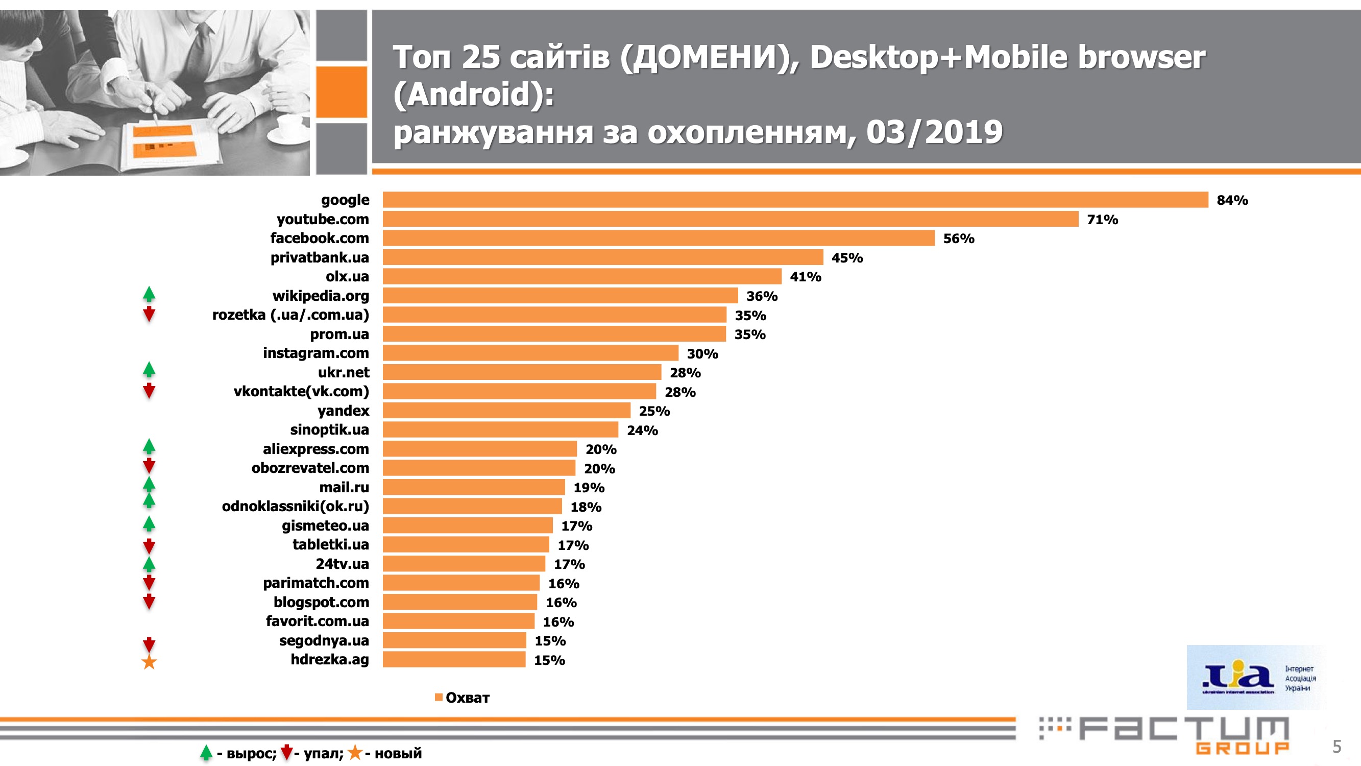 Опубликованы топ-25 сайтов среди украинских интернет-пользователей в марте 2019 года. Были определены самые популярные ресурсы по охвату, доле в день, а также список приложений. Исследование аудитории по заказу ИнАУ провела Factum Group Ukraine.