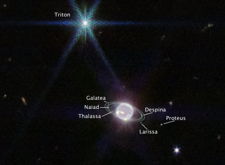 «Видите этот объект в левом верхнем углу? Это не звезда. Это большой, необычный спутник Нептуна, Тритон! Поскольку Тритон покрыт замороженным конденсированным азотом, он отражает 70% падающего на него солнечного света, что делает его очень ярким для Уэбба. Остальные 6 спутников можно увидеть в виде крошечных точек, окружающих Нептун и его кольца», - добавили в NASA.