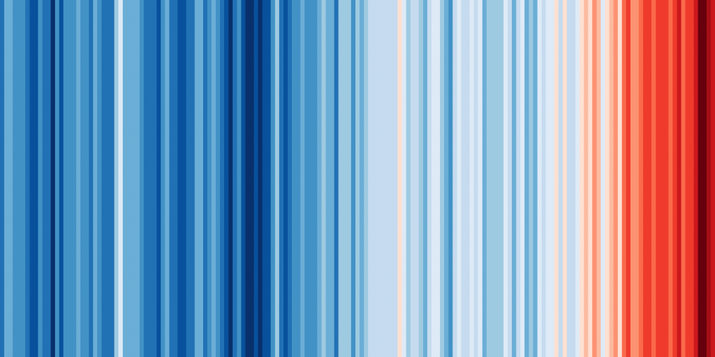 На онлайн-сервисе ShowYourStripes можно посмотреть, как меняется средняя температура на Земле. Температура показана в виде вертикальных полос — от синих до красных. Показатели температуры представлены с 1901 по 2018 год.
