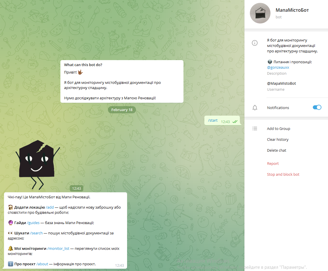 В Украине создали бот «МапаМістоБот» (@MapaMistoBot в Telegram), который поможет оперативно реагировать на снос исторических зданий и бороться с незаконными застройками благодаря открытым данным.