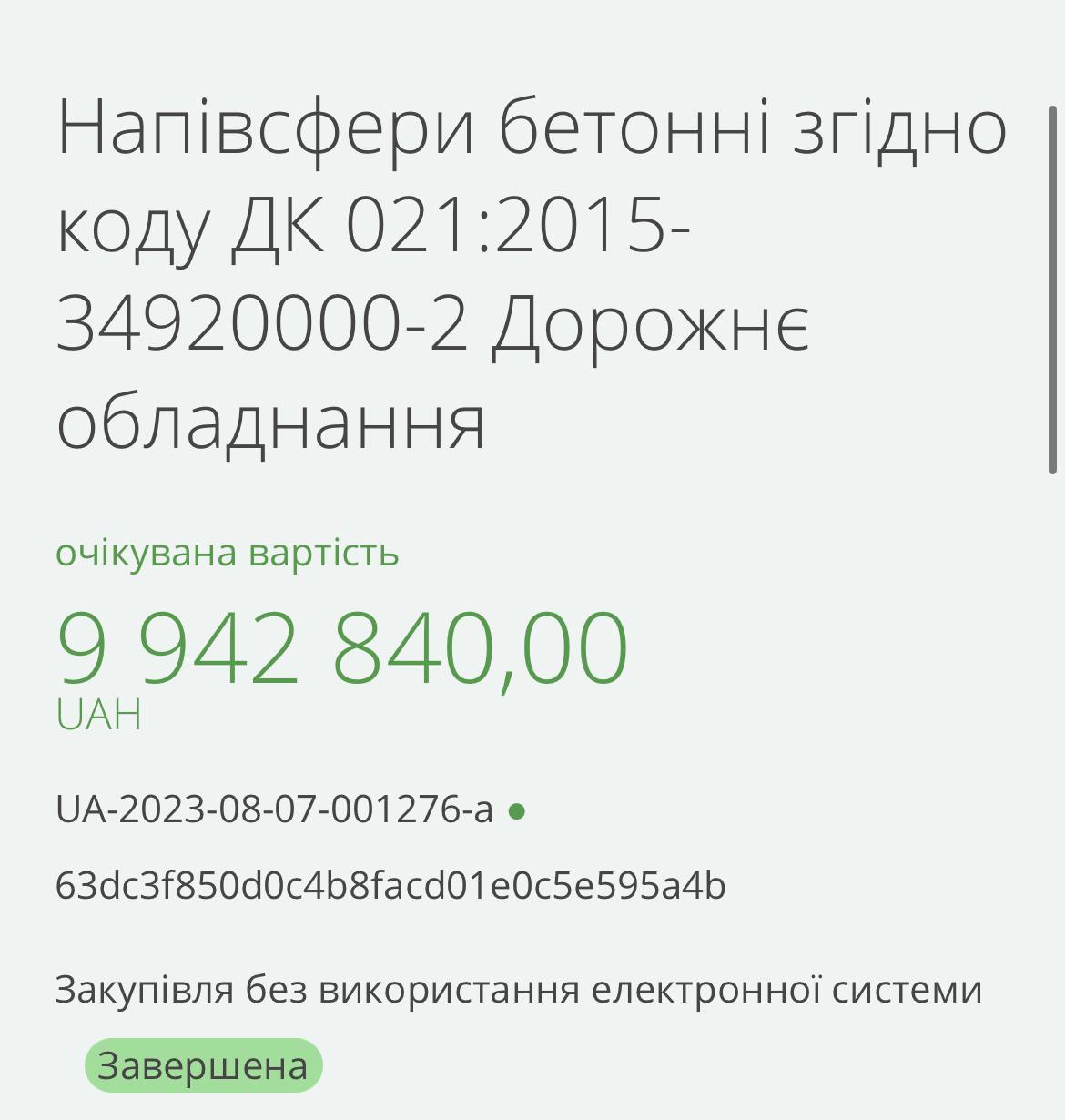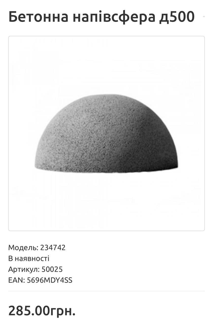 Как пишет канал «Шо по Грошам?», которой отслеживает подобные выходки чиновников, в тендере говорилось о закупке 142 бетонных полусфер д500 за 9 942 800 грн, то есть за одну сферу заплатили 70 019 грн, что в 246 раз дороже среднерыночной цены.