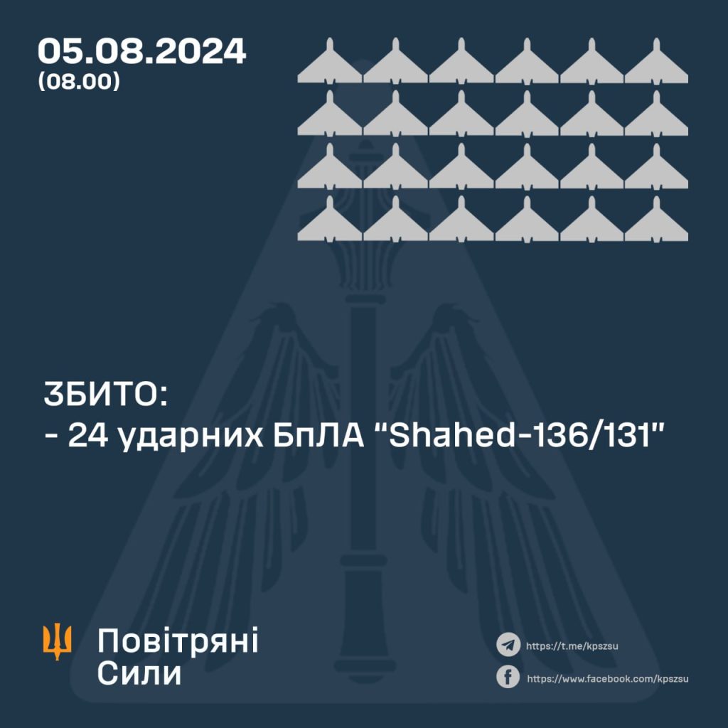 Между тем, в ночь на понедельник российский агрессор атаковал Украину ударными беспилотниками типа Shahed. Атака произошла из районов Приморско-Ахтарского и Курского (рф). Все вражеские беспилотники были успешно уничтожены мобильными огневыми группами Сил обороны Украины, зенитными ракетными подразделениями и средствами радиоэлектронной борьбы Воздушных сил.