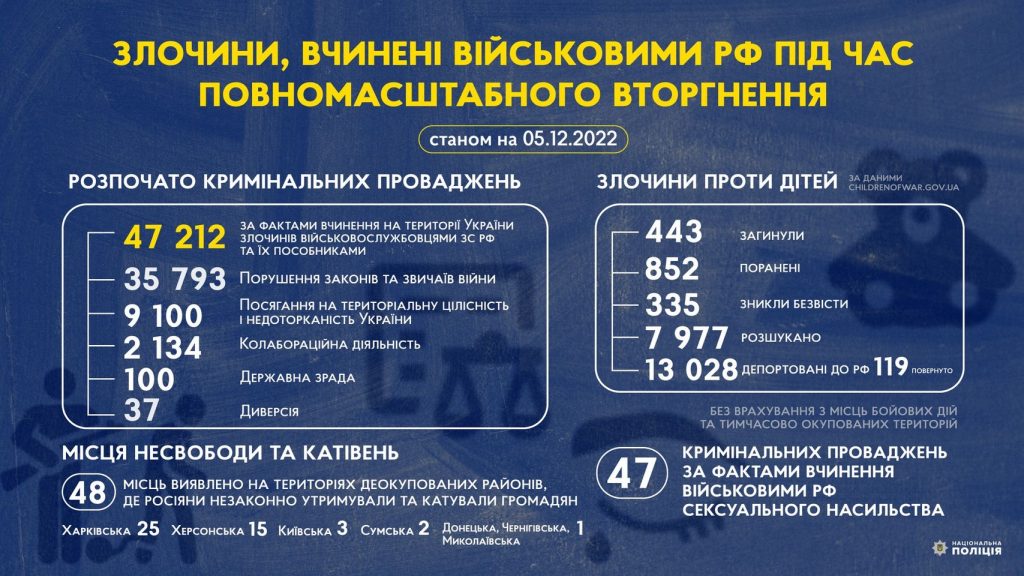 С начала полномасштабного вторжения россии в Украину следователи Национальной полиции Украины начали 47 212 уголовных производств по фактам совершения на территории нашей страны преступлений военнослужащими вооруженных сил российской федерации и их пособниками.