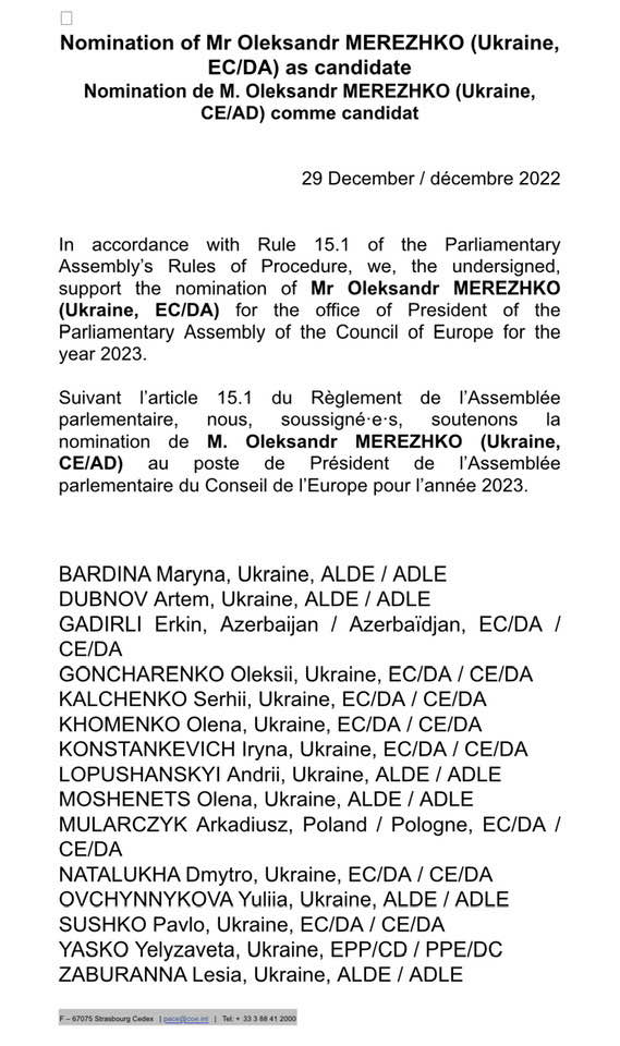 Мережко написал, что искренне благодарен коллегам за поддержку его решения выдвинуть свою кандидатуру на пост президента Парламентской ассамблеи Совета Европы.