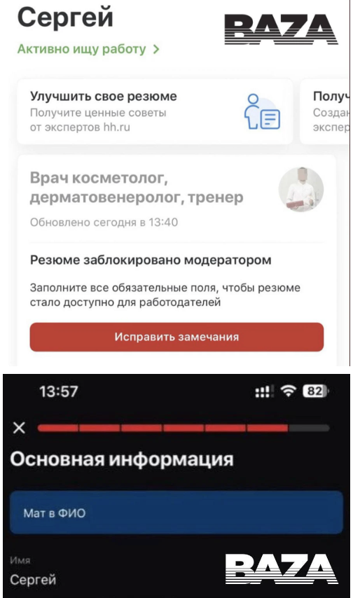 При этом указано, что поводом для отказа в публикации резюме стал мат в ФИО, хотя никаких запретных слов там не было. Кроме того, сообщается, что на ресурсе забанили еще одного пользователя по имени Сергей за некий мат в ФИО. Позже резюме разблокировали.