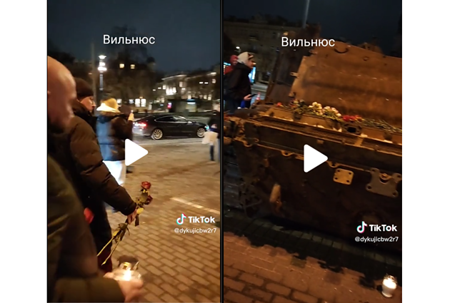 Как известно, Вильнюс - одна из четырех европейских столиц, куда к годовщине полномасштабной войны привезли уничтоженные российские танки как экспонаты. В выходные к танку в Вильнюсе подъехала BMW с номерным знаком «Мой мир», люди из нее положили к танку гвоздики и зажгли лампадку.