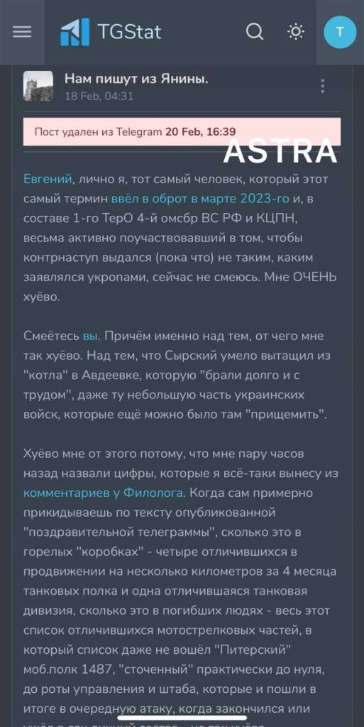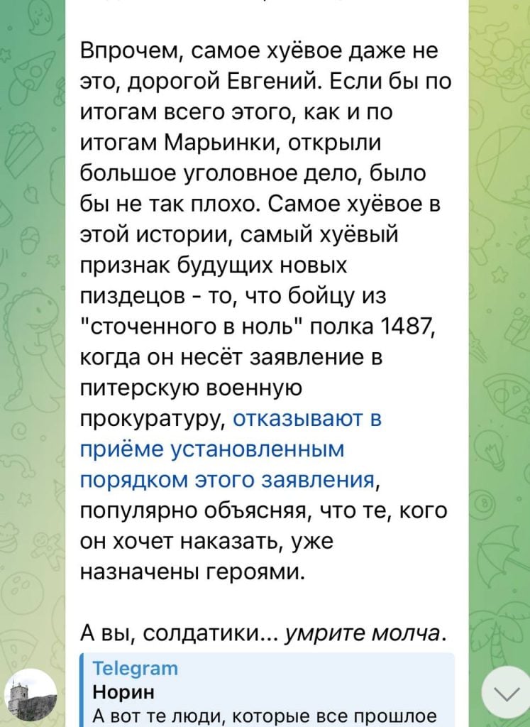 У пості, який військового змусило видалити начальство, повідомляється про російські втрати в боях за Авдіївку і про те, що одному з військовослужбовців «сточеного майже до нуля» полку 1487 відмовили в прийманні за цим фактом заяви у військовій прокуратурі Петербурга.