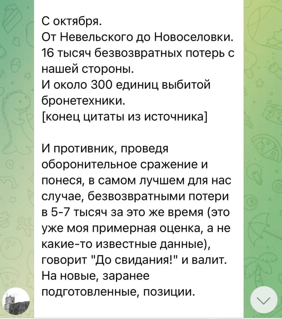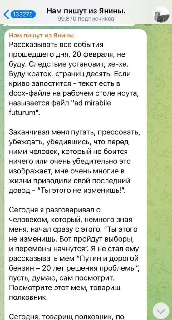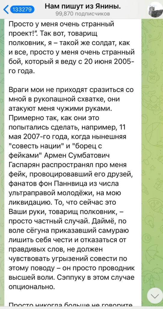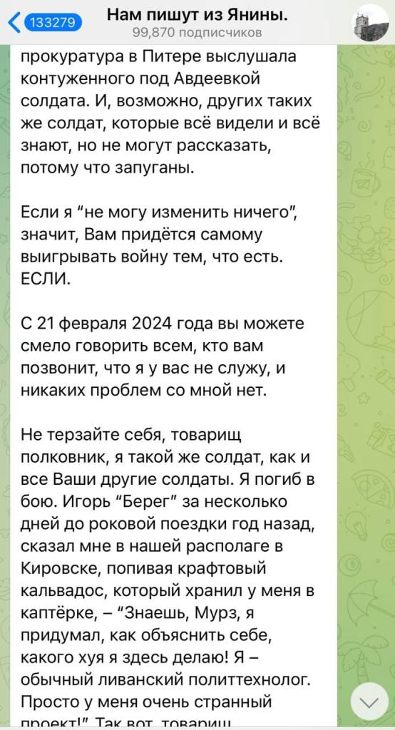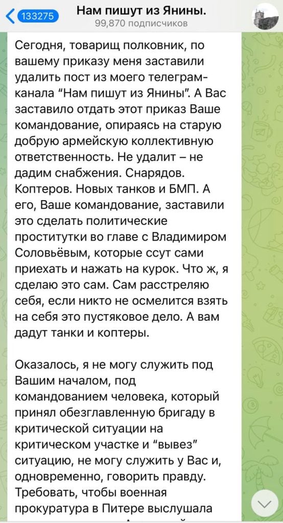 «Сьогодні, товаришу полковнику, за вашим наказом мене змусили видалити пост із мого телеграм-каналу «Нам пишуть із Яніни». А Вас змусило віддати цей наказ Ваше командування, спираючись на стару добру армійську колективну відповідальність. Не видалить - не дамо постачання: снарядів, коптерів, нових танків та БМП. А його, Ваше командування, змусили це зробити політичні повії на чолі з Володимиром Соловйовим, які ссуть самі приїхати та натиснути на курок. Що ж, я це зроблю сам. Сам розстріляю себе, якщо ніхто не наважиться взяти на себе цю мілку справу. А вам дадуть танки та коптери... З 21 лютого ви можете сміливо говорити всім, хто вам зателефонує, що я у вас не служу, і жодних проблем зі мною немає», - йдеться у публікації Морозова.