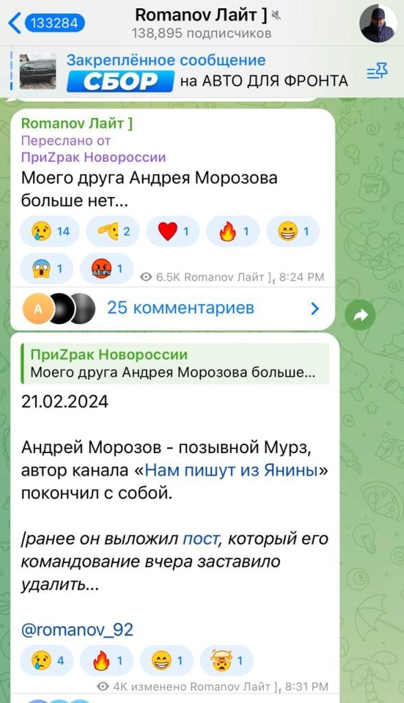 Як випливає з передсмертної публікації Морозова, він наклав на себе руки через те, що керівництво змусило видалити його зі свого телеграм-каналу пост про 16 тисяч загиблих військових рф у боях за Авдіївку.