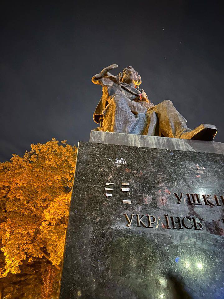 Активісти благодійного фонду «Солом’янські котики» повісили на пам'ятник Пушкіну яскраву демаскувальну сітку у вівторок. Таким чином вони хотіли нагадати суспільству та владі, що символи російського імперіалізму досі є в містах, і прискорити процес дерусифікації.