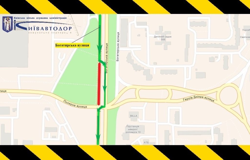 У цей період рух транспорту на ділянці до перетину з вул. Полярною буде організовано лівою смугою вул. Богатирської. Регулювання дорожнього руху на перехресті вулиць Богатирської та Полярної не зміниться.