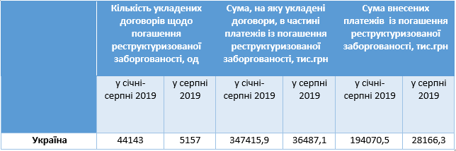 Відповідно до постанов Кабінету Міністрів України від 21.10.1995 № 848 та від 27.06.2003 № 976 у січні-серпні 2019 року з населенням було укладено 44,1 тис. договорів щодо погашення реструктуризованої заборгованості (таблиця 1).