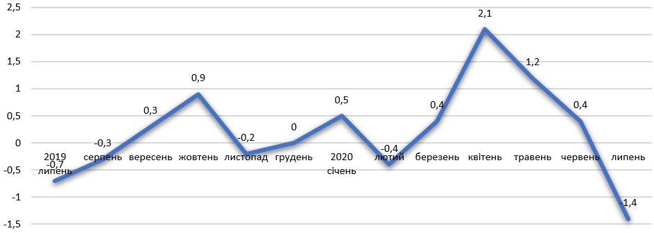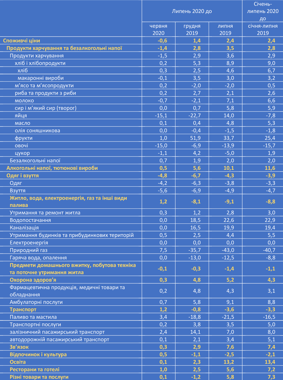 Споживчі ціни в липні 2020 року у порівняні із червнем 2020 року знизилися на 0,6%. З початку року зростання споживчих цін Держстат фіксує на рівні - 1,4%.