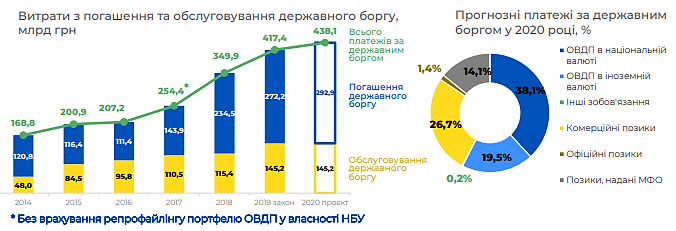 Виплати та фінансування обслуговування боргу залишаються високими й становлять більше третини доходів. У 2020 році виплати становитимуть близько 438,1 млрд грн, з яких обслуговування державного боргу – 145,2 млрд грн; погашення державного боргу – 292,9 млрд гривень.