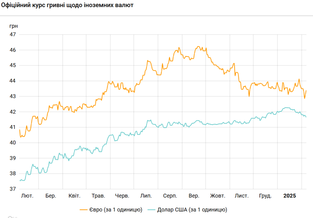 Це мінімальний рівень з 16 грудня 2024 року (41,607 грн/долар).