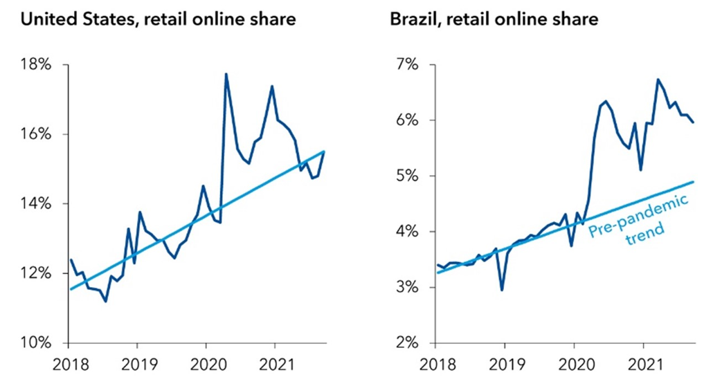 Частка онлайн-витрат, як і раніше, вище допандемічних тенденцій приблизно в половині країн, від великих економік, таких як Бразилія та Індія, до інших країн із середнім рівнем доходу, зокрема Бахрейн і Ямайка.