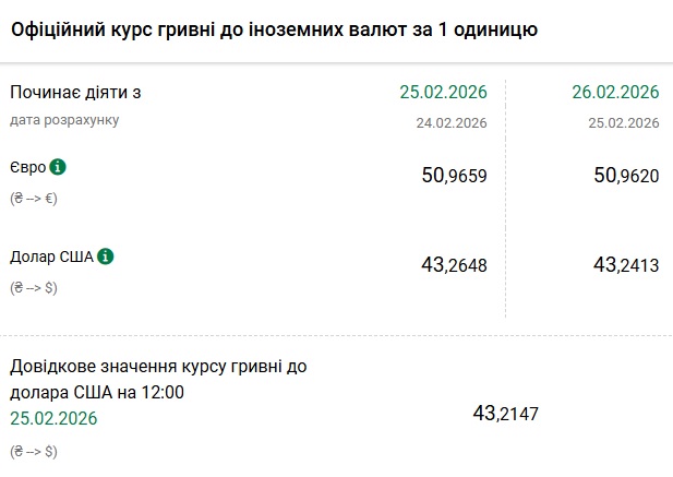 - 1 долар США – 43,24 грн (43,26 грн станом на 25 лютого)