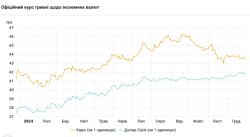 Офіційний курс на 30 грудня 2024 року встановлено на рівні 41,9403 гривень за 1 долар (+0,0956 грн).