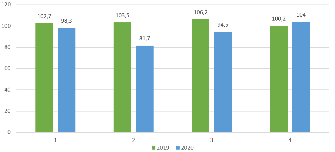 У IV кварталі 2020 році обсяг послуг, реалізованих підприємствами сфери послуг споживачам, становив 264,2 млрд. грн. Про це повідомляє Держстат. Згідно з повідомленням, обсяг послуг, реалізованих підприємствами становить 104,0% до обсягу відповідного кварталу 2019 року (рис. 1).