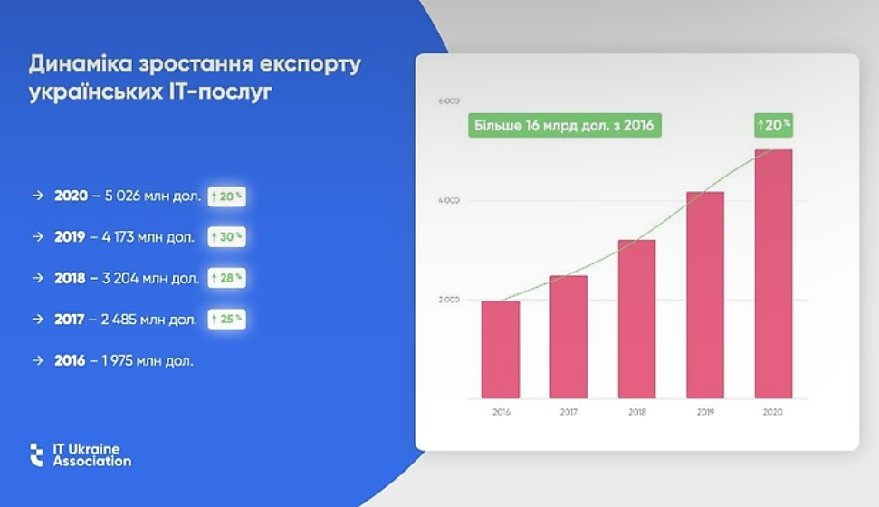 Проте з поміж сфери послуг ІТ-сектор продемонстрував позитивні тенденції. Навіть більше, висхідна динаміка ІТ-послуг торік продемонструвала зростання попри кризовий 2020 рік, й проти показників 2019 року експорт послуг збільшився на 20%, перевищивши $5 млрд.