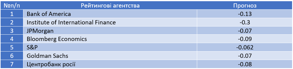 Згідно з очікуваннями провідних прогнозистів, економіку країни-агресора чекають значні потрясіння. JPMorgan наразі прогнозує зниження ВВП росії на 12,5%, оскільки на державу звалилися безпрецедентні санкції, які заморозили її золотовалютні резерви в обсязі 630 мільярдів доларів та ізолювавши економіку від решти світу.