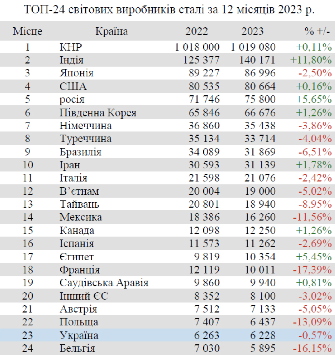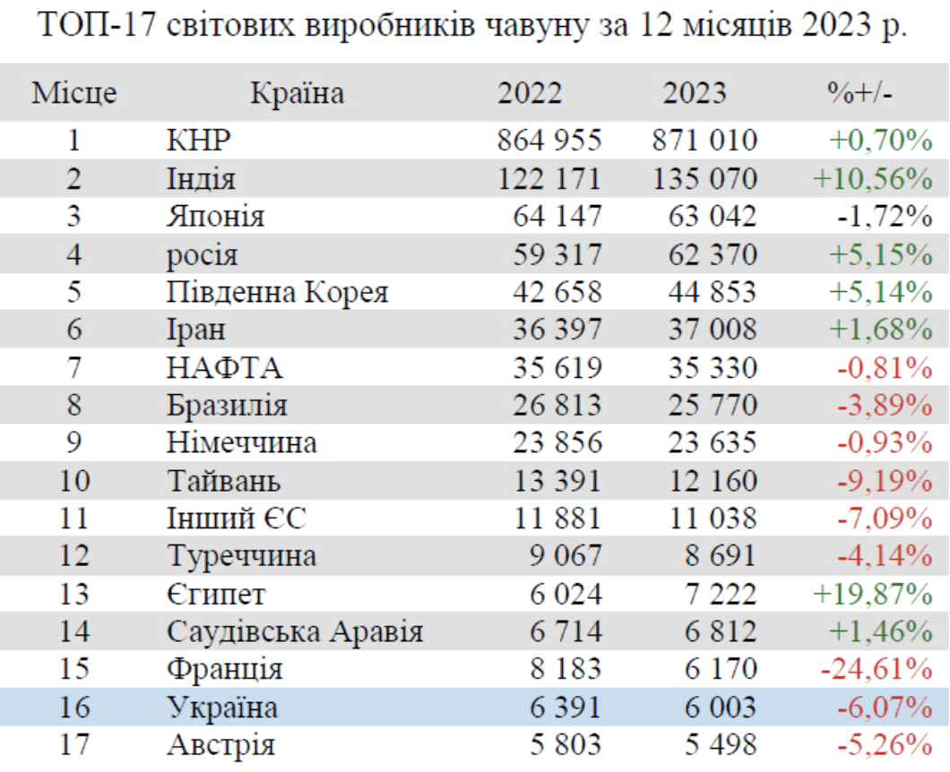 Україна залишилася на 16-му місці серед 40 найбільших країн-виробників чавуну та на 23-му — серед 71 країни-виробника сталі.