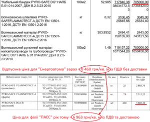 Рік тому, в жовтні-листопаді 2024 року «Енергоатом» та філія «Південноукраїнська АЕС» замовляли «Атоменергоресурсу» рулонний матеріал Pyro-Safe DG-CR як товар із доставкою по 6 963 грн/кв. м, що складало $168. У доларах це було на 16% дешевше за нинішню ціну. При цьому судячи з даних сайту виробника, Pyro-Safe DG і Pyro-Safe DG-CR – це одне й те ж.