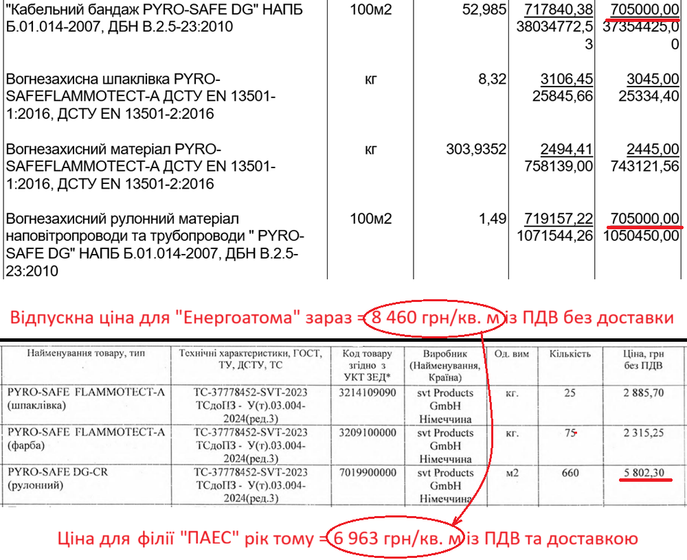 Вогнезахисна фарба Pyro-Safe Flammotect-А врахована по 2 934 грн/кг, а вогнезахисна шпаклівка Pyro-Safe Flammotect-А – по 3 654 грн/кг. Це дорівнює цінам вересневої угоди «Енергоатома» з «Атоменергоресурсом» про їхню закупівлю як товарів із доставкою.