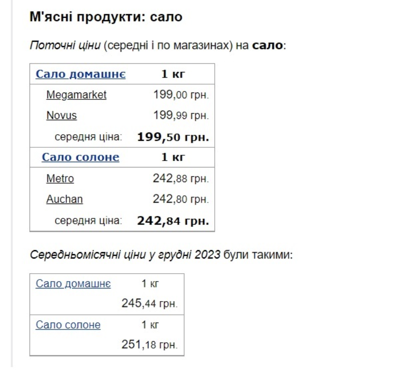 Сьогодні середня ціна на солоне сало в українських супермаркетах становить 242,84 грн/кг. При цьому у грудні продукт продавали за вищою ціною – 251,18 грн/кг. Тобто воно подешевшало на 8,34 грн.