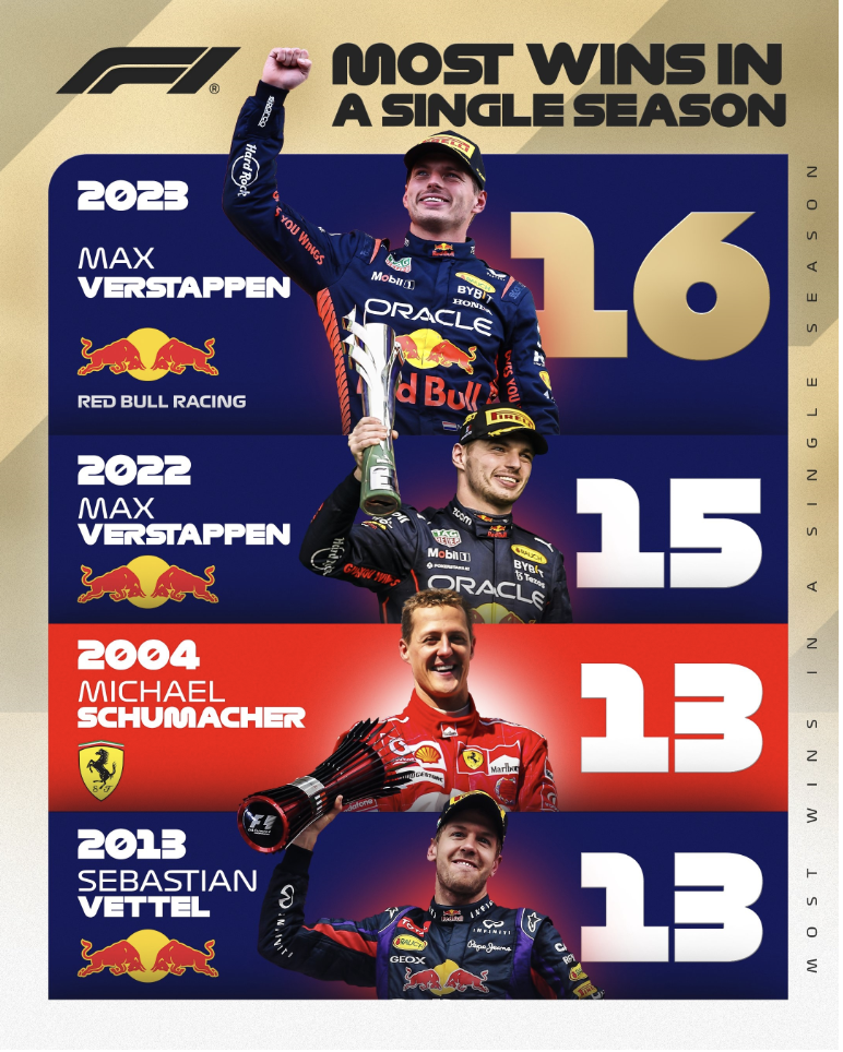 Ферстаппен встановив рекорд в історії Ф-1 за кількістю перемог у сезоні – йому вдалося виграти 16-й етап цього року. Попереднє досягнення (15 перемог) було встановлено минулого сезону і також належить Максу. На третьому місці із 13 перемогами за рік розташувався легендарний Міхаель Шумахер.