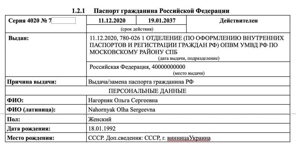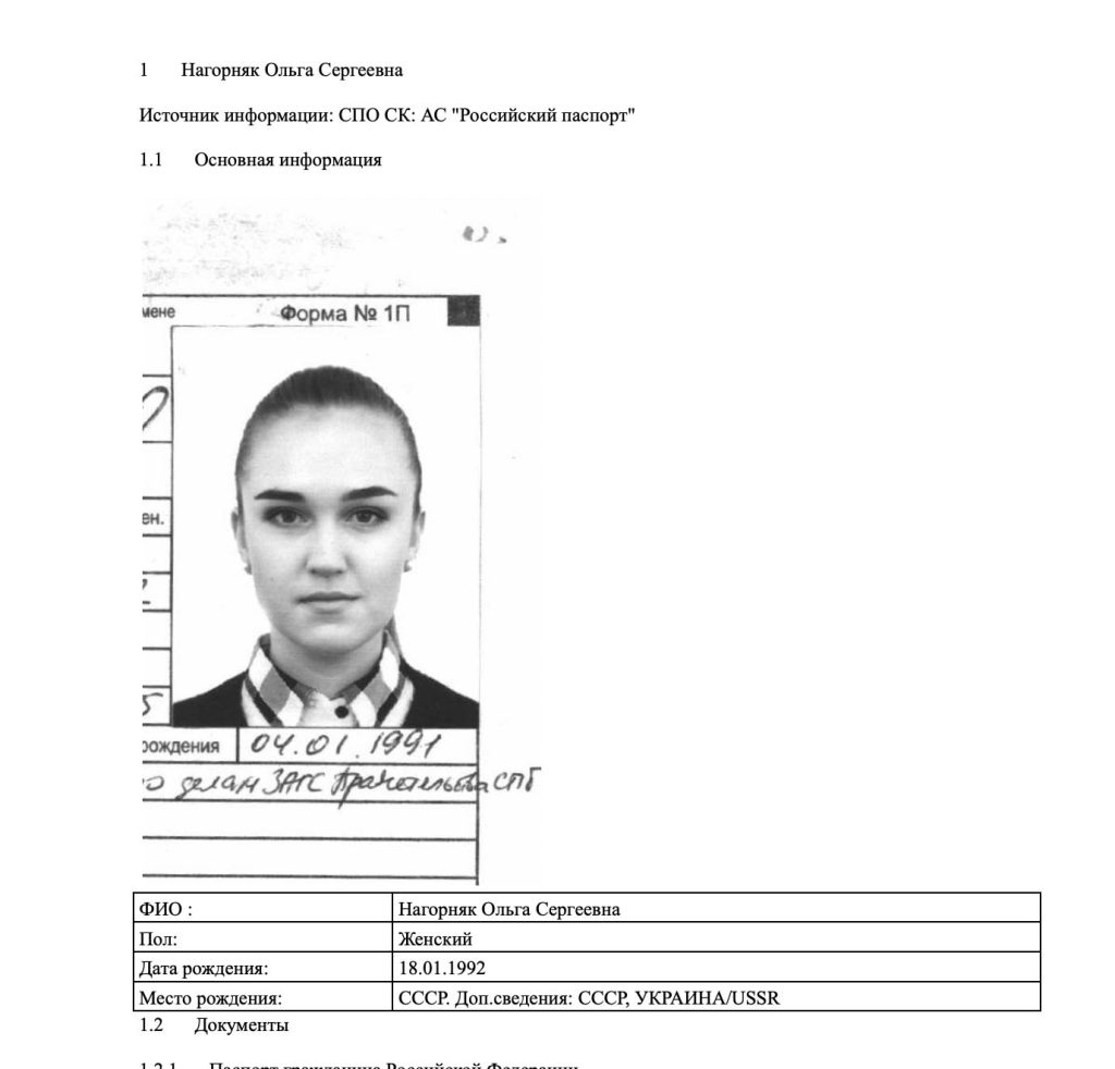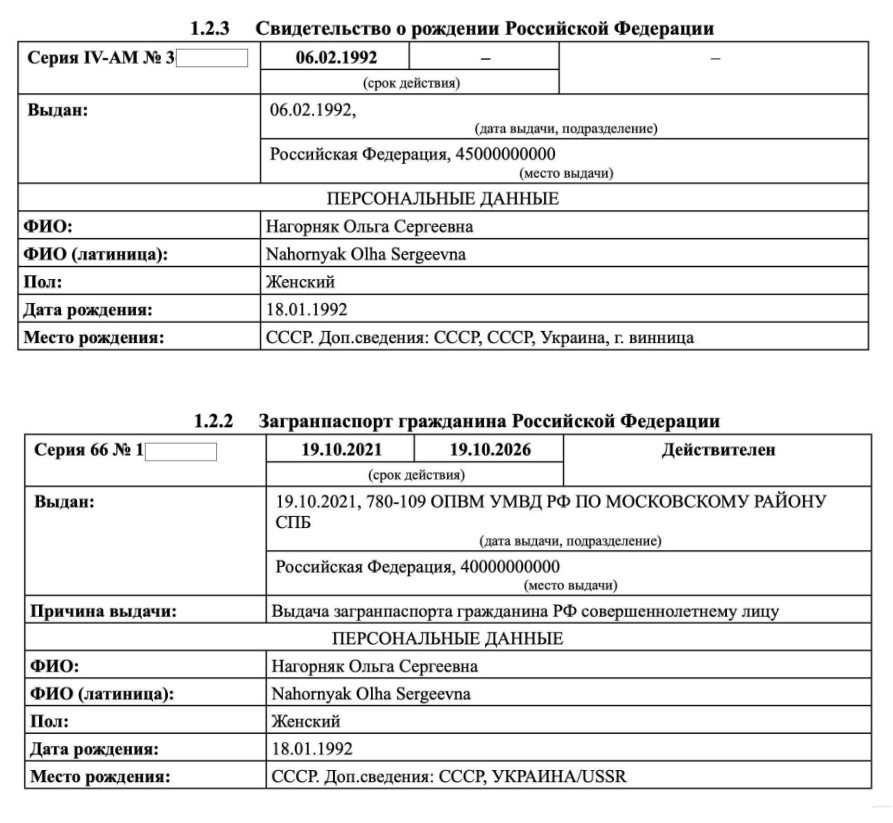 «Ми точно знаємо, що в Ольги Нагорняк 2 паспорти: України та російської федерації. І що востаннє українським паспортом Ольга скористалася напередодні активної фази війни – 14.11.2021. Вона покинула територію України через авіапункт пропуску «Бориспіль» у напрямку Стамбула, і назад уже не поверталася. Якщо тільки не використала свій новий російський паспорт, який отримала 2020 року», - зазначає 360.ua.