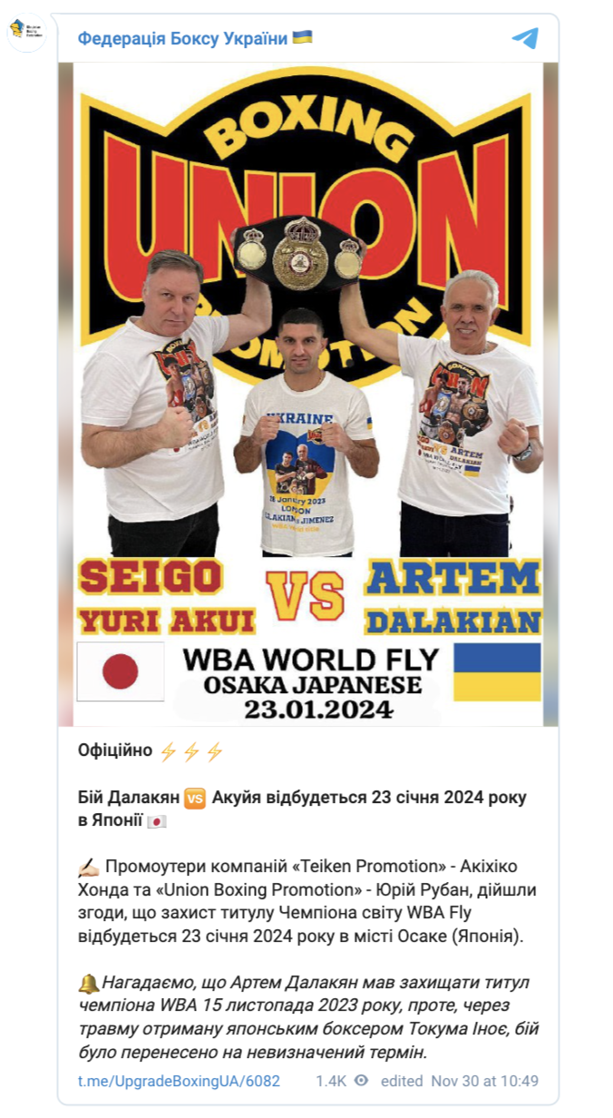 Стали відомі нові дата та місце раніше перенесеного поєдинку між чемпіоном WBA у найлегшій вазі українцем Артемом Далакяном і обов’язковим претендентом на титул японцем Сейго Акуї.