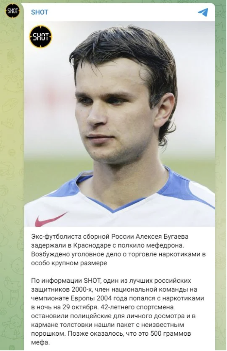 «Спортсмен почав пити і накопичив борги — близько 70 тисяч несплачених податків із пенями. Зневірившись, Бугаєв знайшов спосіб заробити через Даркнет — у наркошопі. Дістав через бариг близько пів кілограма мефедрону, який мав закладками розкласти у Краснодарі та Сочі. Ексзахисник уже здав своїх наркоспільників. У телефоні у нього також знайшли фото місць, де він розклав закладки, з точними координатами», — йдеться у повідомленні Telegram-каналу Shot.