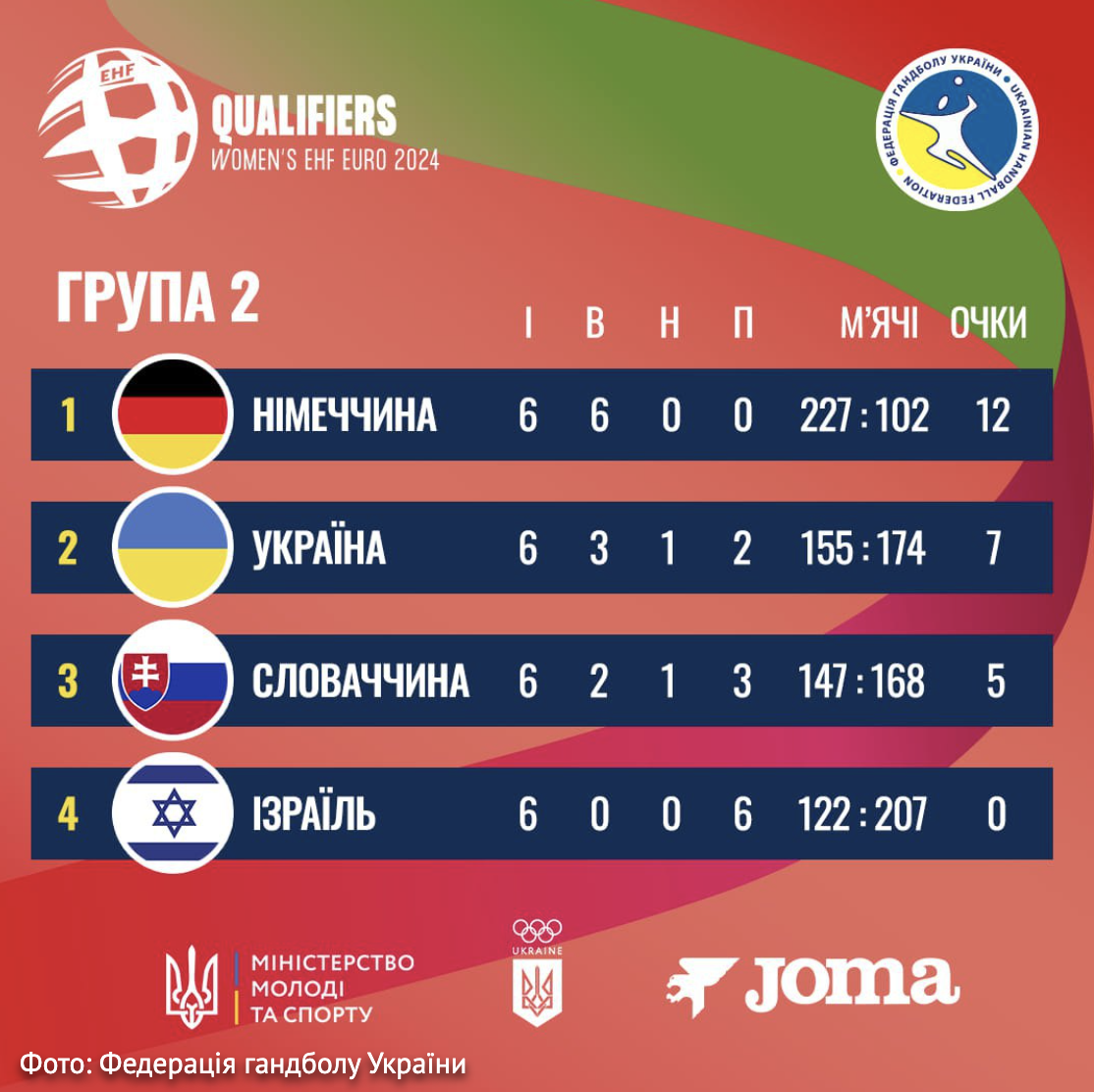 За даними Федерації гандболу, українки двічі перемогли Ізраїль, виграли та зіграли унічию у матчах проти Словаччини та не здобували очок в поєдинках з переможцем групи Німеччиною.