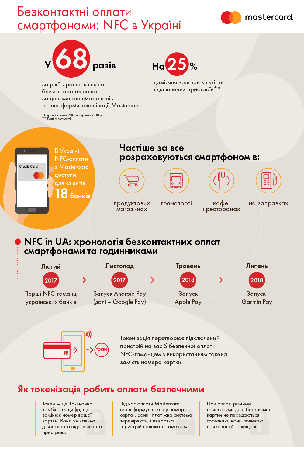 Оплата за допомогою безконтактних носіїв стає дедалі популярнішою в Україні. За даними Mastercard, за останній рік, кількість таких платежів за допомогою смартфонів та інших пристроїв NFC зросла у 68 разів (включно із оплатами через мобільні гаманці банків та сервіси Google Pay, Apple Pay та Garmin Pay).