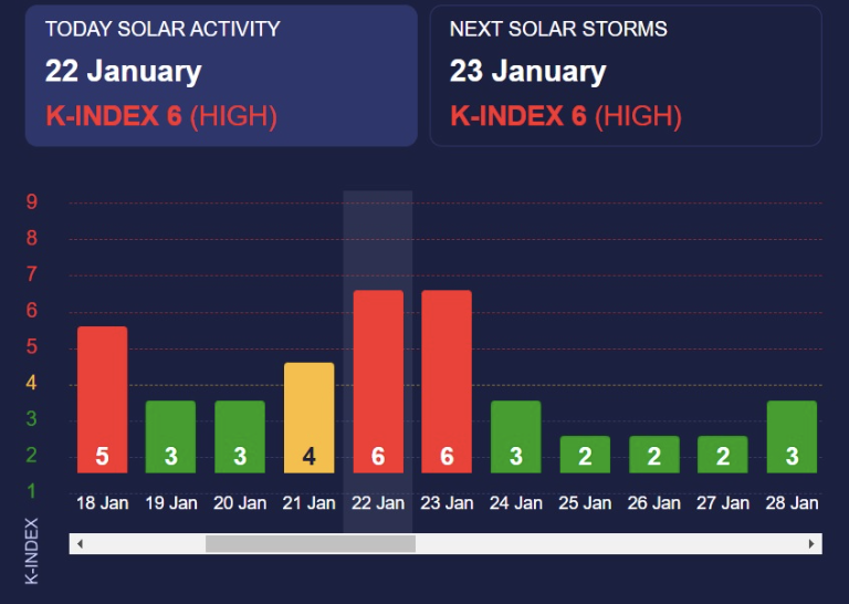 Так, згідно з даними сайту Meteoagent, 22 і 23 січня Землю накрила магнітна буря середньої сили, К-індекс досяг 6. За прогнозами сайту, після цього на жителів нашої планети чекає тривалий перепочинок, магнітних бур не очікується до середини лютого.
